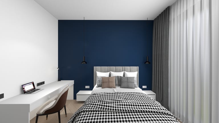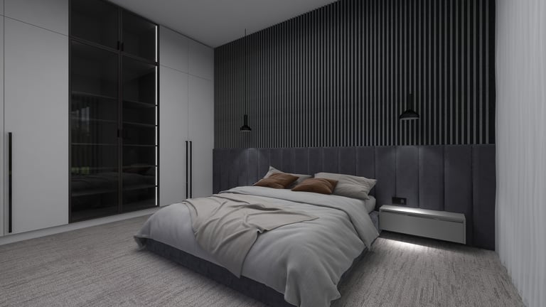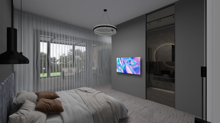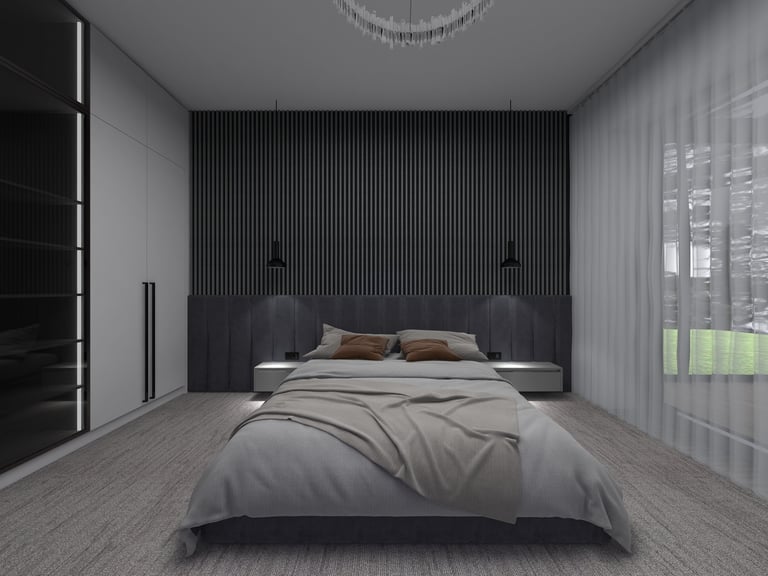 Daug laiko skirta ieškant miegamojo galvūgalio ir svetainės TV sienų išpildymams. Pasirinkti vizualiai ir techniškai paprastesni variantai.