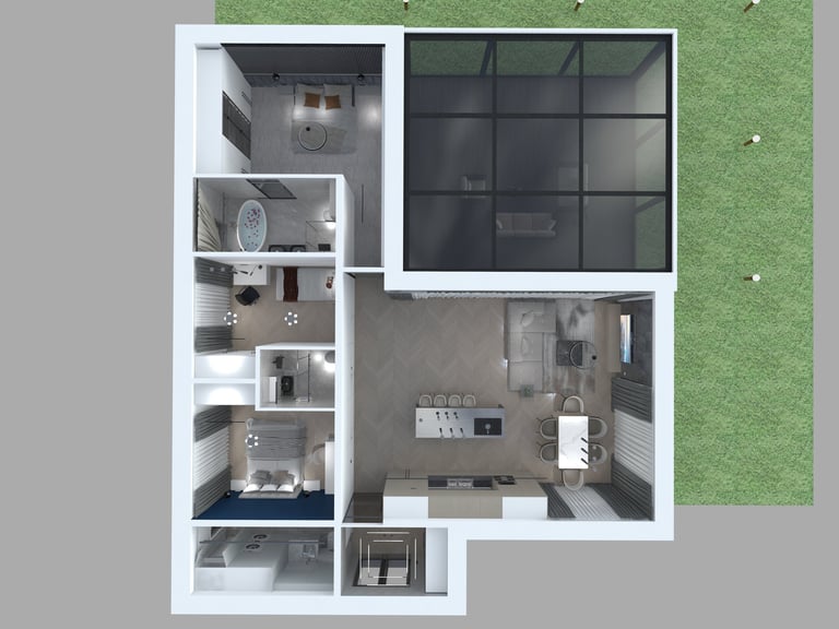 Projekto kūrimo eigoje, klientas paprašė parodyti, kaip atrodys didelė terasa, nors jos statyba planuojama ateityje.